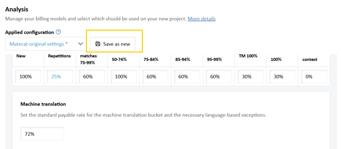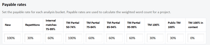 A billing model is the set of payable rates used to calculate the weighted word count for a project. The payable rate is the percentage of raw words that will be paid for each analysis bucket. This rate can vary based on segment categories such as 100% match, repetition, fuzzy matches, and new words. Below are Matecat's default payable rates.