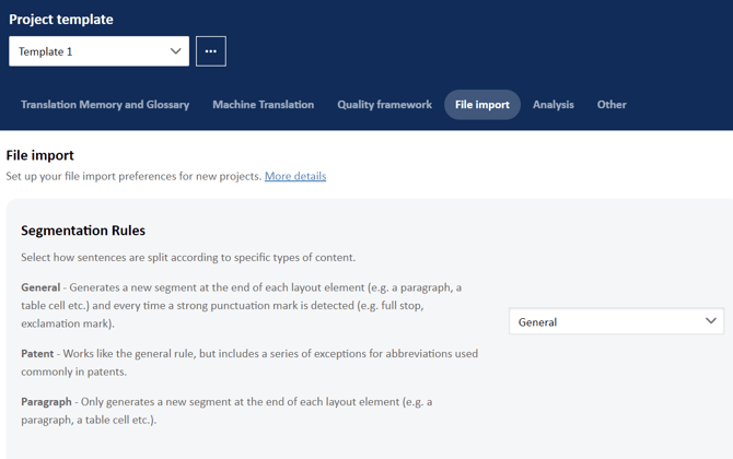 You can choose among three segmentation rules, depending on how you want Matecat to split the text into segments. Select the desired option from the drop-down menu:
