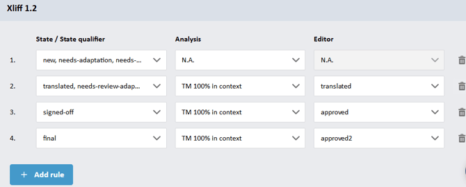 For XLIFF 1.2 files, you can define behavior according to the state and state-qualifier values specified in the standard. State-qualifiers take precedence over states. Therefore, if you have set a specific behavior for segments with the ‘translated’ state and a different behavior for those with the ‘exact-match’ state-qualifier, a segment marked with both will be processed according to the ‘exact-match’ state-qualifier.