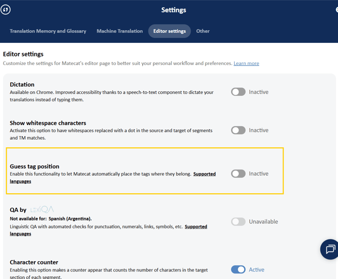 For a number of language pairs, Matecat automatically places the tags where they belong in the target language. We analyzed millions of segments processed by professionals and observed how they handled all types of tags and used Machine Learning techniques to let Matecat learn where to place them.