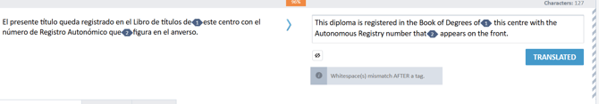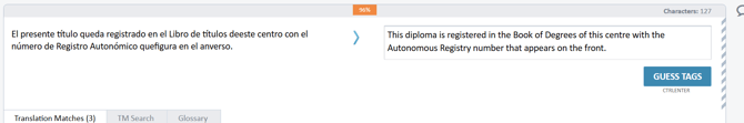 After translating the segment, just click on the Guess tags button or use the shortcut CMD/CTRL+Enter. Matecat will display the tags in the source segment and place them in the right position in the target segment. If Matecat misplaces the tags, you can fix the position just like you’re used to doing and then confirm the translation by clicking on Translated.