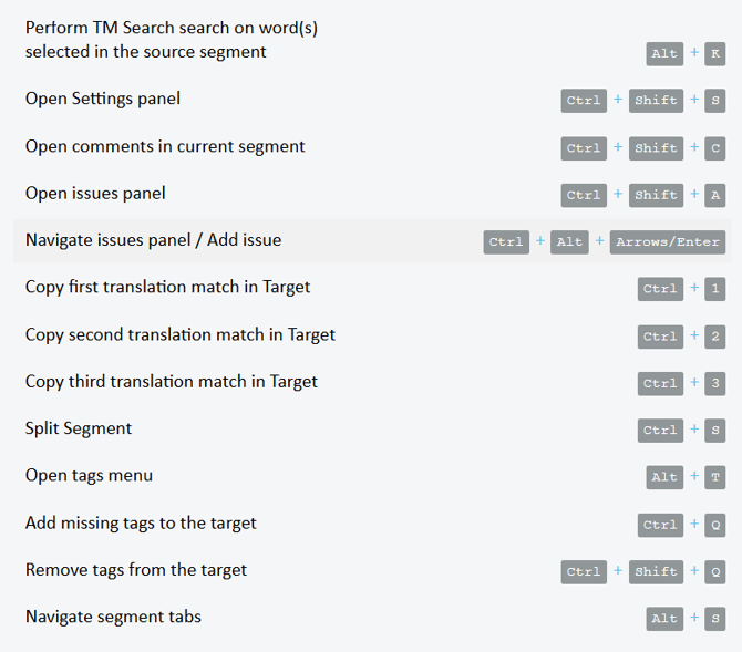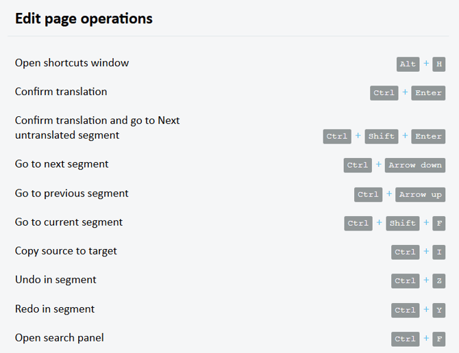 Matecat relies heavily on keyboard shortcuts for standard and advanced functionalities. Getting to know the shortcuts below will help you be more productive and faster when translating in Matecat.