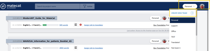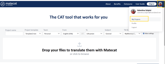 In order to create a team, you need to access the Management panel. Click on your profile button on the top bar of the Matecat homepage and choose MyProjects to see a list of all the projects created using your account.