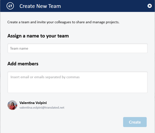 A pop-up window opens where you are asked to give a name to your team and to add members to share and manage projects by entering their email addresses separated by commas. To confirm, click on the blue Create button.