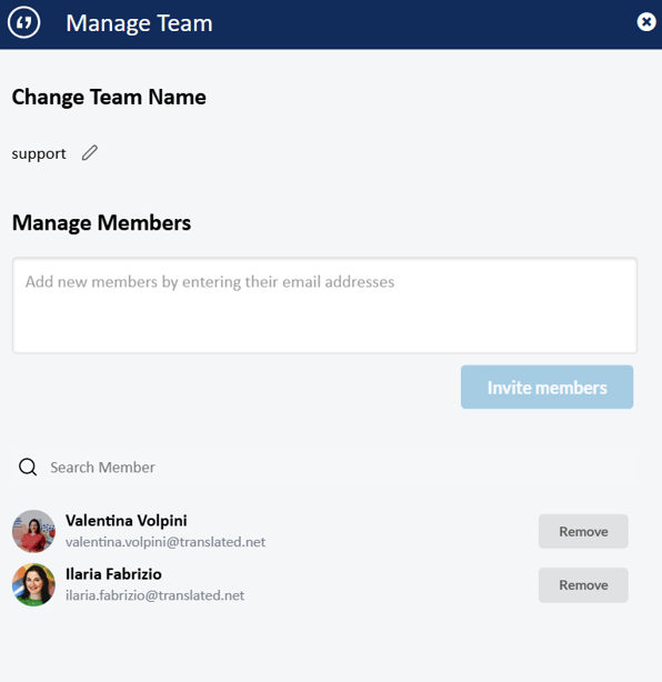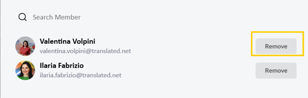 To remove one of the team members, hover the mouse over their email address and click on Remove. If you remove the last member, the team will be deleted and all the projects will be moved to the Personal area.