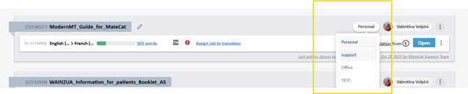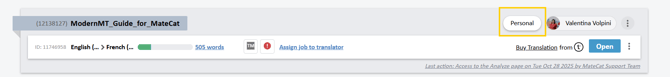 You can create a project from the homepage and share it with an existing team. Upload files from the Matecat homepage – in this case, the project will be visible on the Management panel in the default workspace, i.e. the Personal area. Initially, the project will be labelled Personal, as below: