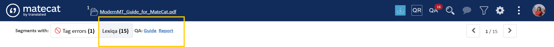 warns the user that there is a potential issue within the ongoing translation job. Click on the icon to bring up the lexiQA dashboard, where you will find: