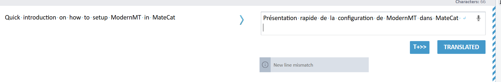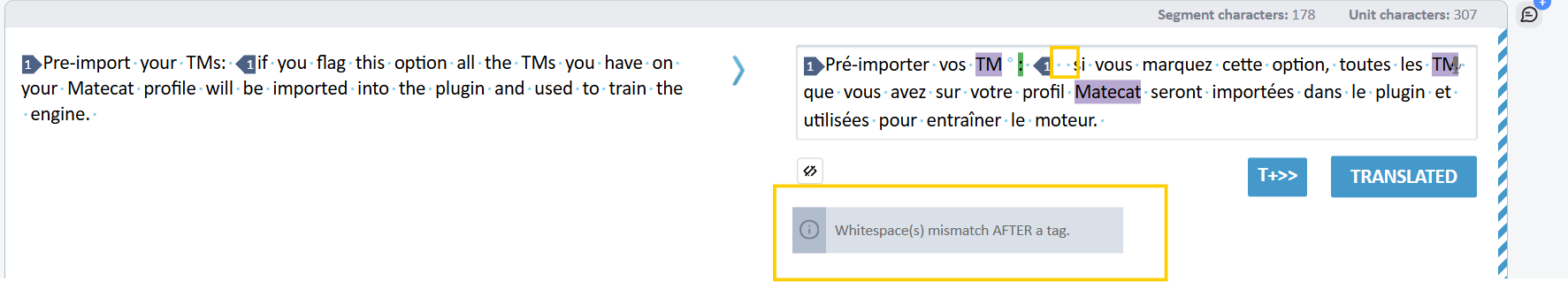 Matecat will also perform a number of additional checks to guarantee that the source and target segments contain the same elements and symbols (new line and tabulation, $, #, @, £, %, =, *).