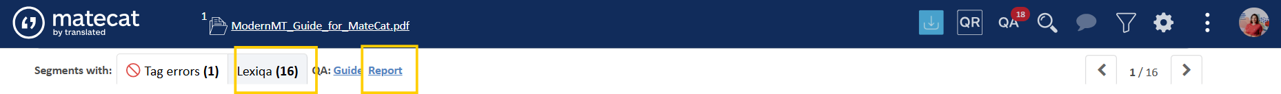 When you are translating, Matecat automatically performs a number of automated checks on the consistency of the segment. The top bar on the Translation Editor page features an icon that warns of any potential QA (quality assurance) issues in the translation. The warning sign includes a circle indicating the number of issues found in the project. However, none of these issues prevents you from downloading the translated file, unless these include tag issues, which need to be addressed in any case.