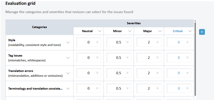 The evaluation grid manages categories and severity levels during revision. Categories are used to categorize the type of error found, while severity levels measure the gravity of the error.
