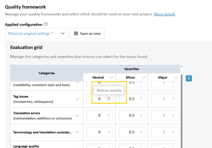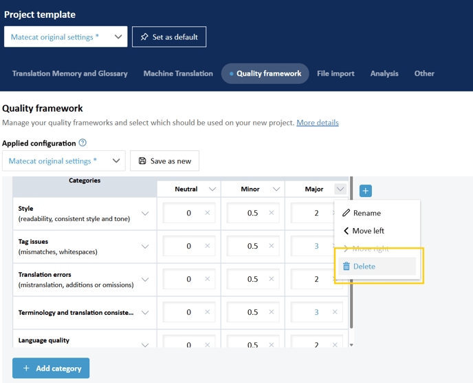 Matecat has a default quality framework that it uses for all projects for which a custom quality framework is not chosen.