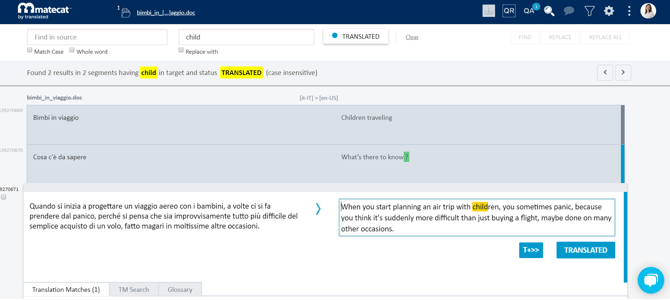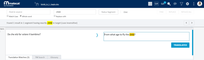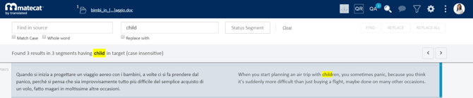 Notice that the replacement applies to all segments. In the translate mode, it changes the text and the segment status as well. So if you replace a term in a draft segment, you will notice that it will be changed and saved as translated.