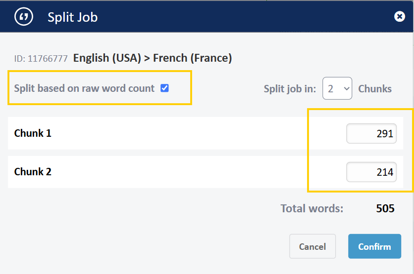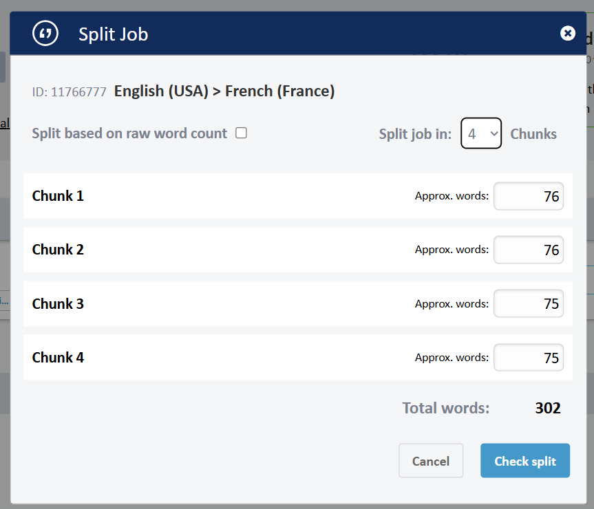 You can also decide to split the jobs based on the raw word count.In this case it will not take into consideration repetitions, fuzzy matches, or TM leverage.