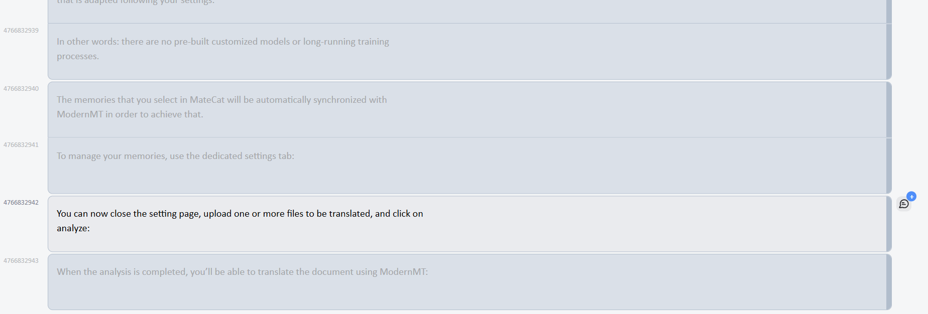 Matecat provides an easy-to-use split functionality to divide large jobs into smaller parts and assign them to multiple translators. It also allows more translators to work simultaneously using the same translation memories, glossaries and even to discuss any issues related to the translation right within the tool itself, thanks to the comments feature. This is useful for large collaborative projects.