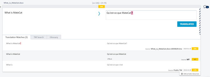 When you open a segment for translation, Matecat will automatically pre-populate it with the best TM or MT match available.